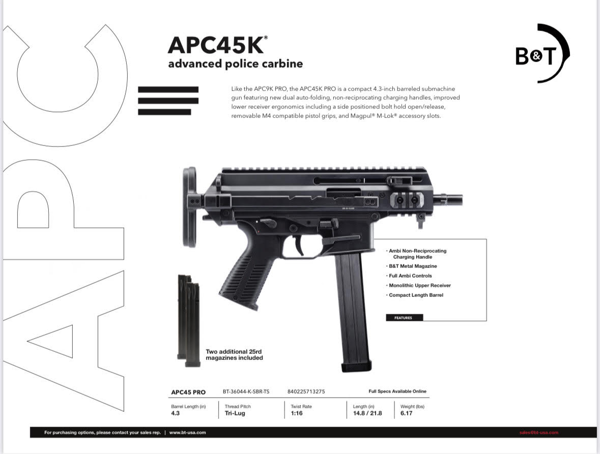 The B&T APC45K Pro SBR model APC45 K + 3 MAGS Bundle represents a solid choice for anyone seeking quality and reliability. With proven performance and thoughtful design, it’s ready to serve your needs. Review the specifications below, and if you have questions, don’t hesitate to reach out.
