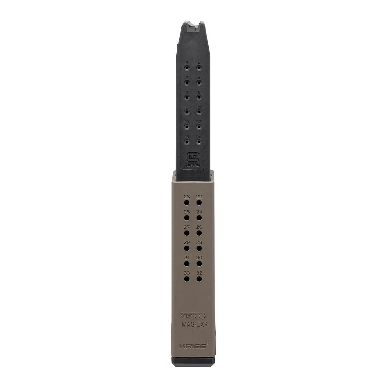 Elevate your shooting experience with the KRISS MagEx2 Extended Magazine Kit, the definitive upgrade for your KRISS Vector, Glock handgun, or compatible PCC. This premium extended magazine kit is engineered for superior reliability and increased round capacity, ensuring you stay on target longer. Crafted in a durable polymer and finished in a tactical Flat Dark Earth (FDE) color, it combines rugged performance with modern aesthetics.