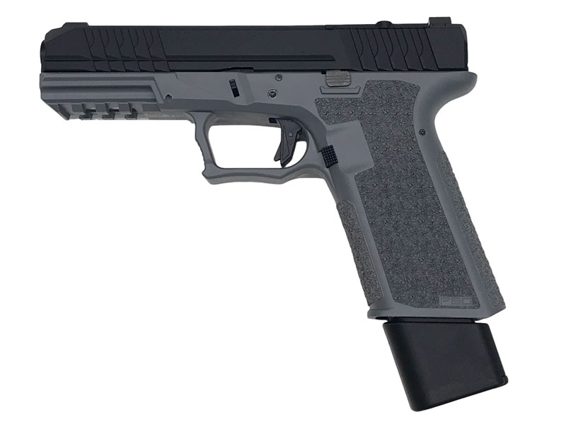 TheP80 PFS9pistol features front and rear angled slide serrations, thumb/accelerator cut, and a double-undercut trigger guard. It also has a flat-faced polymer trigger, aggressive textured grip with 1911 grip angle, and an extended beaver-tail.