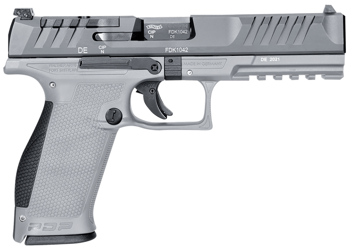 The WALTHER ARMS PDP OR comes equipped with standard sights, providing a clear sight picture.